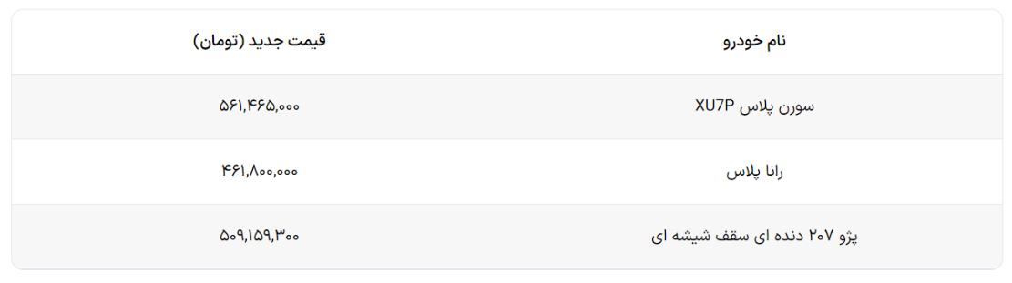 بر اساس فراخوان های جدید شرکت ایران خودرو، قیمت جدید دو محصول سورن پلاس XU7P، پژو ۲۰۷ دنده ای سقف شیشه ای و رانا پلاس اعلام شده است. بر همین اساس قیمت جدید سورن پلاس XU7P که به عنوان جانشین پژو پارس شناخته می شود ۴۶۹ میلیون تومان در نظر گرفته شده است و قیمت رانا پلاس نیز ۴۶۲ میلیون تومان محاسبه شده است. پژو ۲۰۷ سقف شیشه ای دنده ای نیز از این پس قیمت ۵۰۹ میلیون تومان را خواهد داشت. هر سه محصول کاهش جزئی را در قیمت های جدید داشته اند و افزایش قیمت چندان چشمگیر نبوده است.