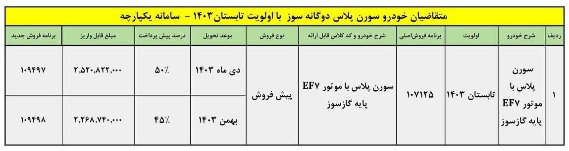 ایران جیب/ به اطلاع متقاضیان و نمایندگی های مجاز میرساند، شرایط پیش فروش (فراخوان) محصول سورن پلاس دوگانه سوز ویژه سامانه یکپارچه با اولویت تابستان 1403 صرفا جهت اولویت های مندرج در این بخشنامه اعلام می شود.