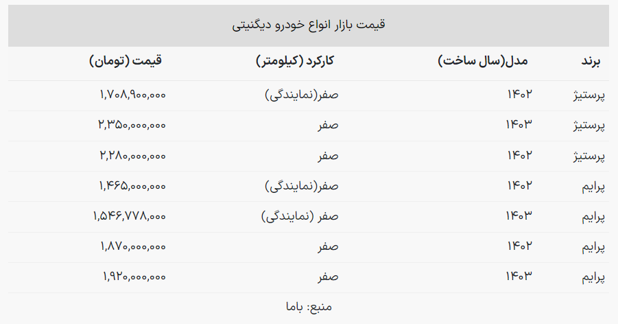 قیمت دیگنیتی صفر مدل پرستیژ ۱۴۰۳ به ۲ میلیارد و ۳۵۰ میلیون تومان رسید که این مدل در یک هفته اخیر ۲۰ میلیون تومان ارزان شده است.
