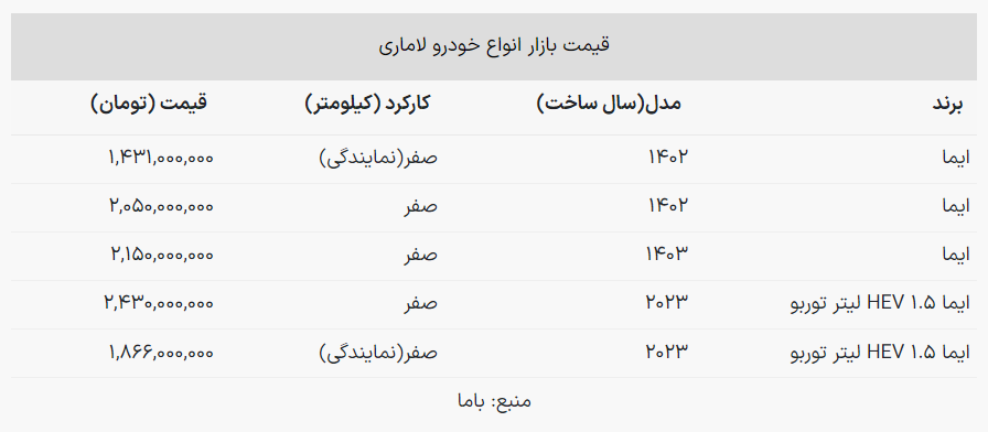 قیمت کارخانه ای لاماری ایما مدل ۱۴۰۲ صفر ۱ میلیارد و ۴۳۱ میلیون تومان است.