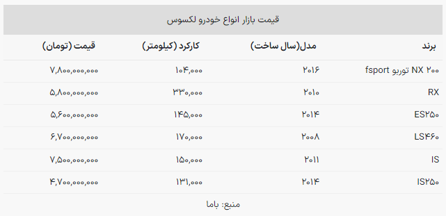 با مطالعه جدول زیر اطلاعات کاملی درباره قیمت روز خودروهای لکسوس به دست خواهید آورد:
