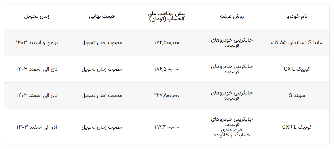 در شرایط فروش محصولات سایپا ویژه مرداد ۱۴۰۳ محصولات ساینا S استاندارد ۸۵ گانه، کوییک GX-L، سهند S و کوییک GXR-L بصورت پیش فروش عرضه می شوند. پیش پرداخت برای تمامی خودروها به صورت علی الحساب است و قیمت نهایی، قیمت مصوب در زمان تحویل خودرو خواهد بود. زمان تحویل برای ساینا S استاندارد ۸۵ گانه بهمن و اسفند ۱۴۰۳ است. برای دو محصول کوییک GX-L و سهند S زمان تحویل دی الی اسفند ۱۴۰۳ در نظر گرفته شده است و برای کوییک GXR-L موعد تحویل آذر الی اسفند ۱۴۰۳ خواهد بود.