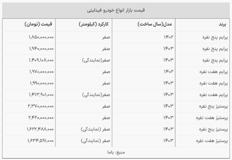 همچنین قیمت فیدلیتی پنج نفره مدل ۱۴۰۳ در بازار ۱ میلیارد و ۹۴۰ میلیون تومان شد.
