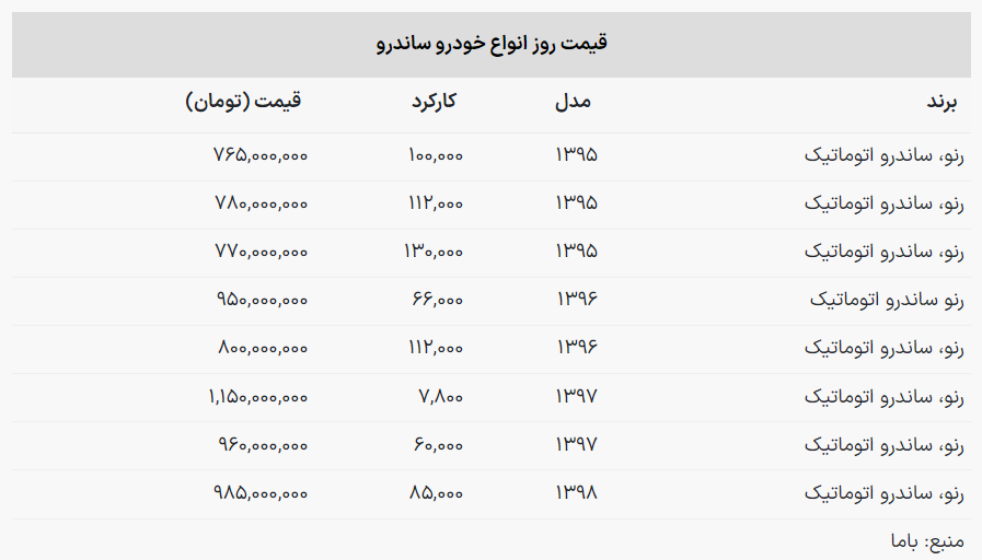با مطالعه جدول زیر اطلاعات کاملی درباره قیمت روز خودروهای ساندرو به دست خواهید آورد: