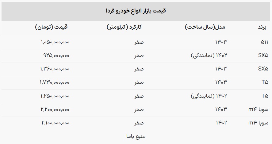 قیمت کارخانه ای فردا موتورز برای سوبا M۴ صفر مدل ۱۴۰۲ یک میلیارد و ۸۵۰ میلیون تومان اعلام شده است.
