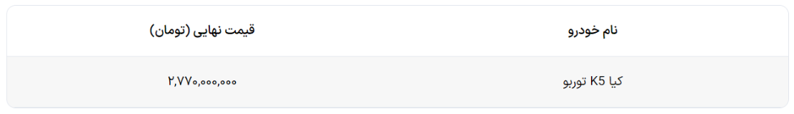 / با ارسال فراخوان های واریز توسط شرکت کوشا خودرو، قیمت کیا K5 توربو اعلام شده است و مشتریان می توانند جهت تکمیل وجه اقدام کنند.