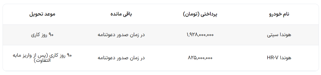 دو خودروی هوندا HR-V و سیتی مدل هایی بودند که توسط شرکت آذریوردسال در سامانه خودروهای وارداتی به عرضه رسیدند و حالا شرایط فروش محصولات هوندا اعلام شده است. بر همین اساس مشتریانی که اولویت تخصیص هوندا سیتی را دارند، می بایست از ۸ تا ۱۳ مردادماه نسبت به پرداخت مبلغ ۱ میلیارد و ۹۲۸ میلیون تومان اقدام نمایند. این مبلغ قطعی در مبادی ورودی است و هزینه ها و عوارض قانونی به آن اضافه می شود و شتری در زمان صدور دعوتنامه می بایست مبلغ اضافی را پرداخت کند. جریمه تاخیر در تحویل ۲.۵ درصد ماهیانه محاسبه می شود و موعد تحویل هم برای این خودرو ۹۰ روز کاری خواهد بود.