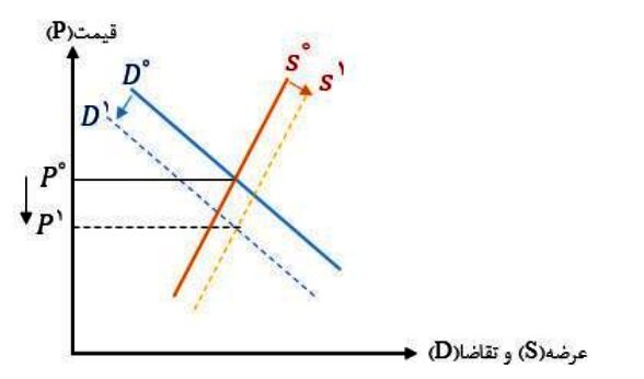 برآیند افزایش عرضه و کاهش تقاضا طبق شکل زیر کاهش قیمت از مقدار P به مقدار P1 است که البته همان طور که اشاره شد این تغییرات بیشتر ناظر بر بازار خودروهای دست دوم است.