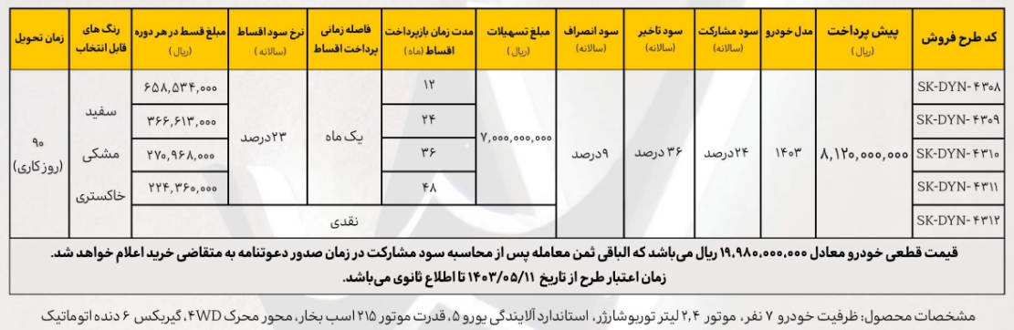 دایون Y7 به عنوان تنها آفرودر چینی در رده خودش شناخته می شود. خودرویی با شاسی مستقل و قابلیت دو دیفرانسیل که می توان با آن بیراهه نوردی کرد. حالا با انتشار جدیدترین بخشنامه فروش صنایع خودروسازی ایلیا، چینی و شرایط اقساطی فروش این خودرو اعلام شده است. بر اساس این شرایط فروش، قیمت دایون Y7 یک میلیارد و ۹۹۸ میلیون تومان اعلام شده است و عرضه آن به صورت نقد و اقساط صورت می گیرد. در شرایط اقساطی پیش پرداخت ۸۱۲ میلیون تومان است و تسهیلات ۷۰۰ میلیون تومانی به مشتریان داده می شود. باز پرداخت این تسهیلات یک تا چهارساله است و فاصله پرداخت اقساط بصورت ماهانه در نظر گرفته شده است. همچنین سود مشارکت در این شرایط فروش ۲۴ درصد سالانه محاسبه می شود و سود تاخیر و انصراف به ترتیب ۳۶ و ۹ درصد سالیانه است.