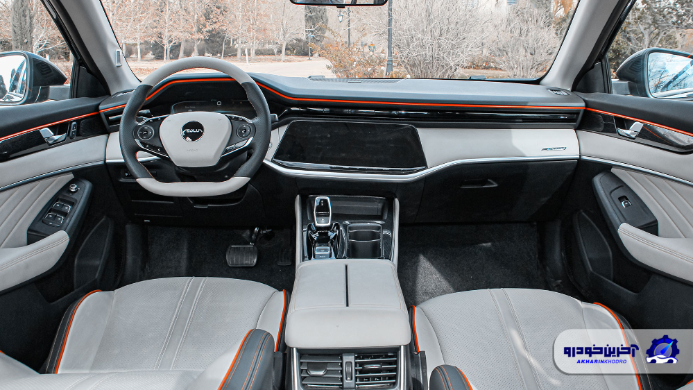 با ورود به داخل کابین، اولین نکته ای که احتمالا در قیاس با سایر چینی های بازار نظر شما را جلب می کند، تریم متفاوتی است که در فضای کابین به کار گرفته شده است. هر چند که این تریم متفاوت را تنها در نسخه بنزینی شاهد هستیم و در نسخه هیبریدی، با تریم مشکی چرم و پلاستیک رو به رو می شویم که تنها ویژگی متفاوت آن، استفاده از نوارها و دوخت های به رنگ فسفری است که به جهت هماهنگی با الگوهای بصری نمای بیرونی به این رنگ درآمده است.