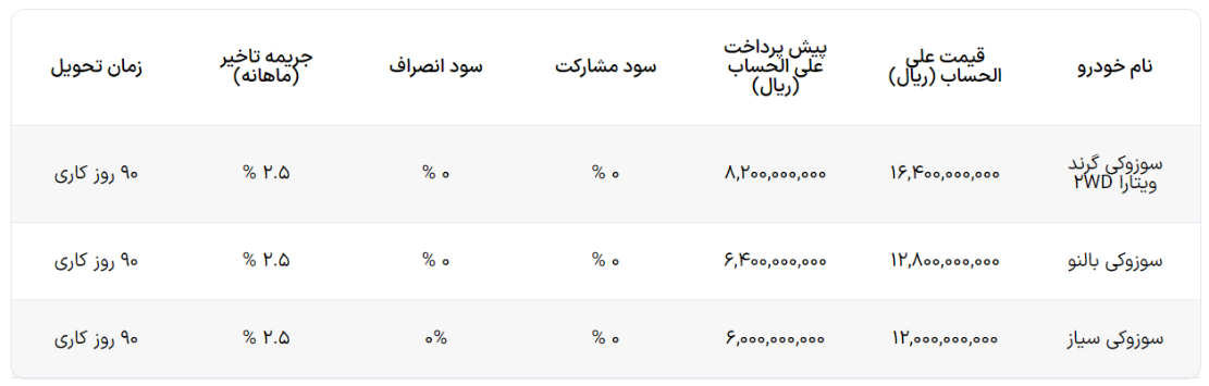 این شرایط فروش برای سه محصول سوزوکی گرند ویتارا ۲WD، بالنو و سیاز بوده و قرار است هر کدام با شرایط و ویژگی های خاص خود به دست متقاضیان برسد.