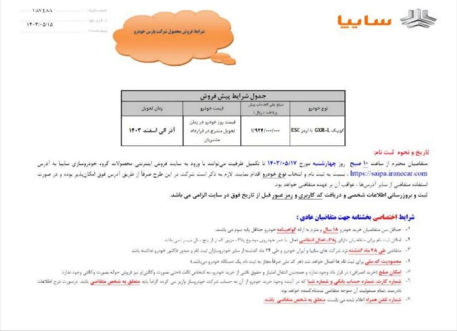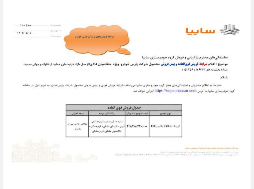گروه خودروسازی سایپا در نظر دارد در راستای افزایش عرضه محصولات و تنظیم بازار، ویژه متقاضیان عادی را از محل مازاد ظرفیت طرح حمایت از خانواده و جوانی جمعیت از ساعت ۱۰ صبح روز چهارشنبه ۱۴۰۳/۰۵/۱۷ از طریق سایت فروش اینترنتی محصولات گروه خودروسازی سایپا به آدرس تا زمان تکمیل ظرفیت فعال کند.