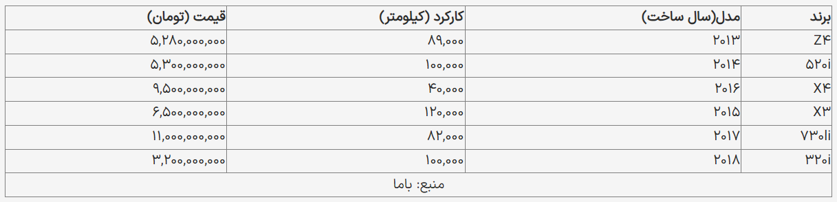 با مطالعه جدول زیر اطلاعات کاملی درباره قیمت روز خودروهای BMW به دست خواهید آورد: