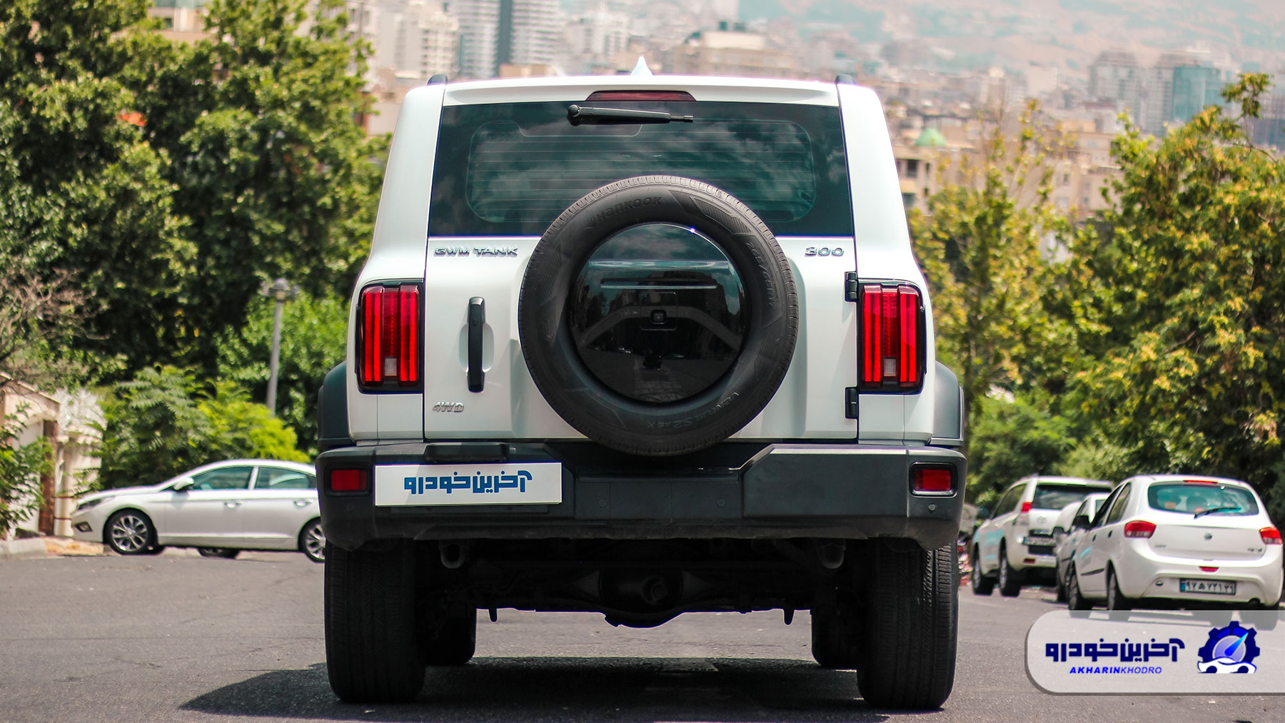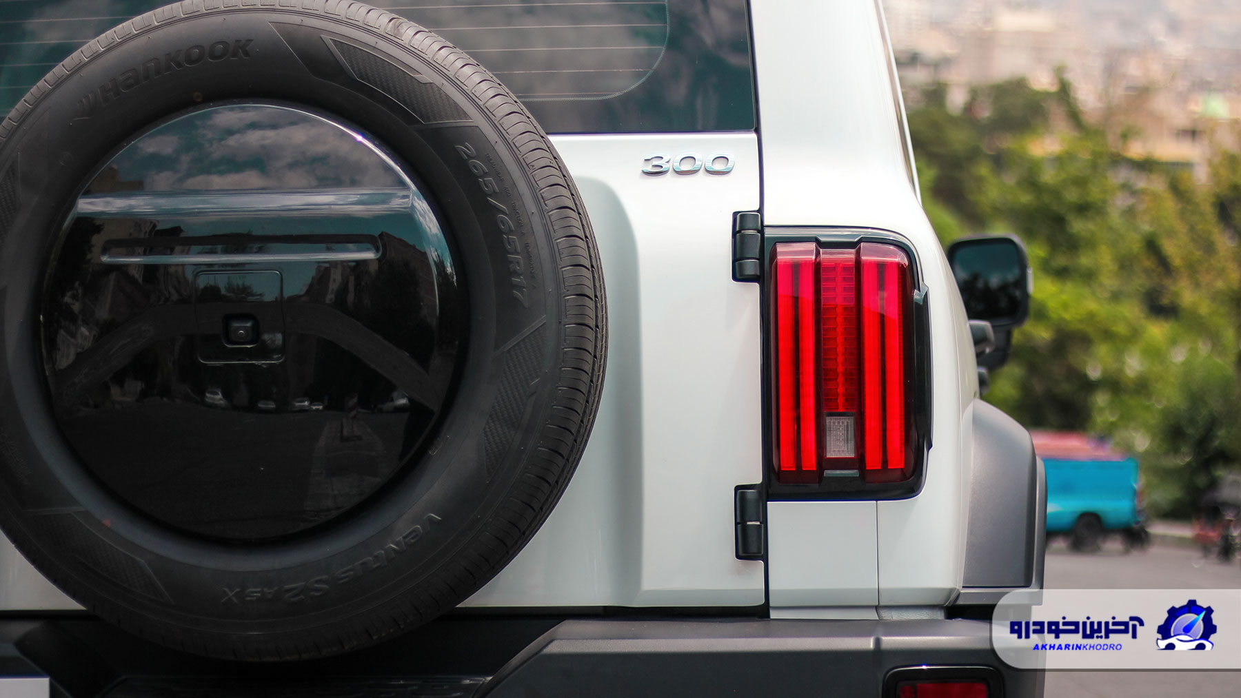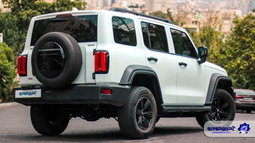 بر خلاف دیگر قسمت های این خودرو، بخش عقب TANK 300 طراحی به نسبت ساده ای داشته و شاهد طراحی های شلوغ و عجیب در این قسمت نیستیم. تایر زاپاس این خودرو به تقلید از آفرودر های ژاپنی بر روی در صندوق عقب قرار گرفته و به همین دلیل جای پلاک به سمت چپ سپر عقب منتقل شده است.