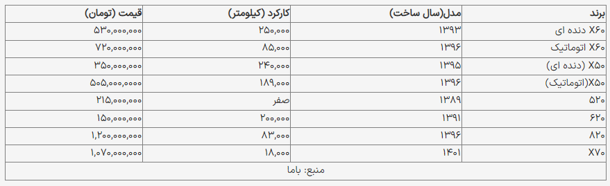 قیمت لیفان X۶۰ دنده ای کارکرده مدل ۱۳۹۳ هم که ۲۵۰ هزار کیلومتر کارکرد دارد ۵۳۰ میلیون تومان برای فروش گذاشته شده است.