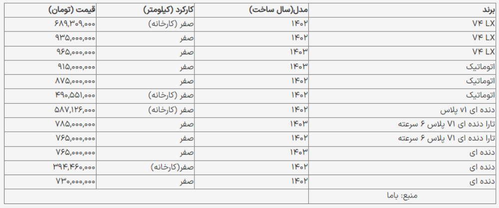 تارا دنده ای V۱ پلاس ۶ سرعته نیز ۷۸۵ میلیون تومان شد.