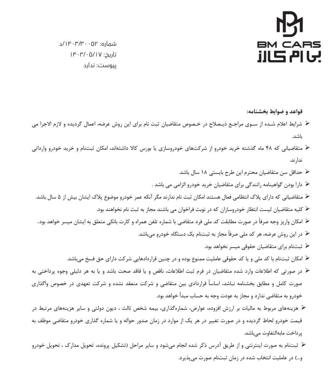 همچنین گروه بی ام کارز بنا دارد در هفته دوم مهرماه ۱۴۰۳ این خودرو را تحویل متقاضیان دهد.