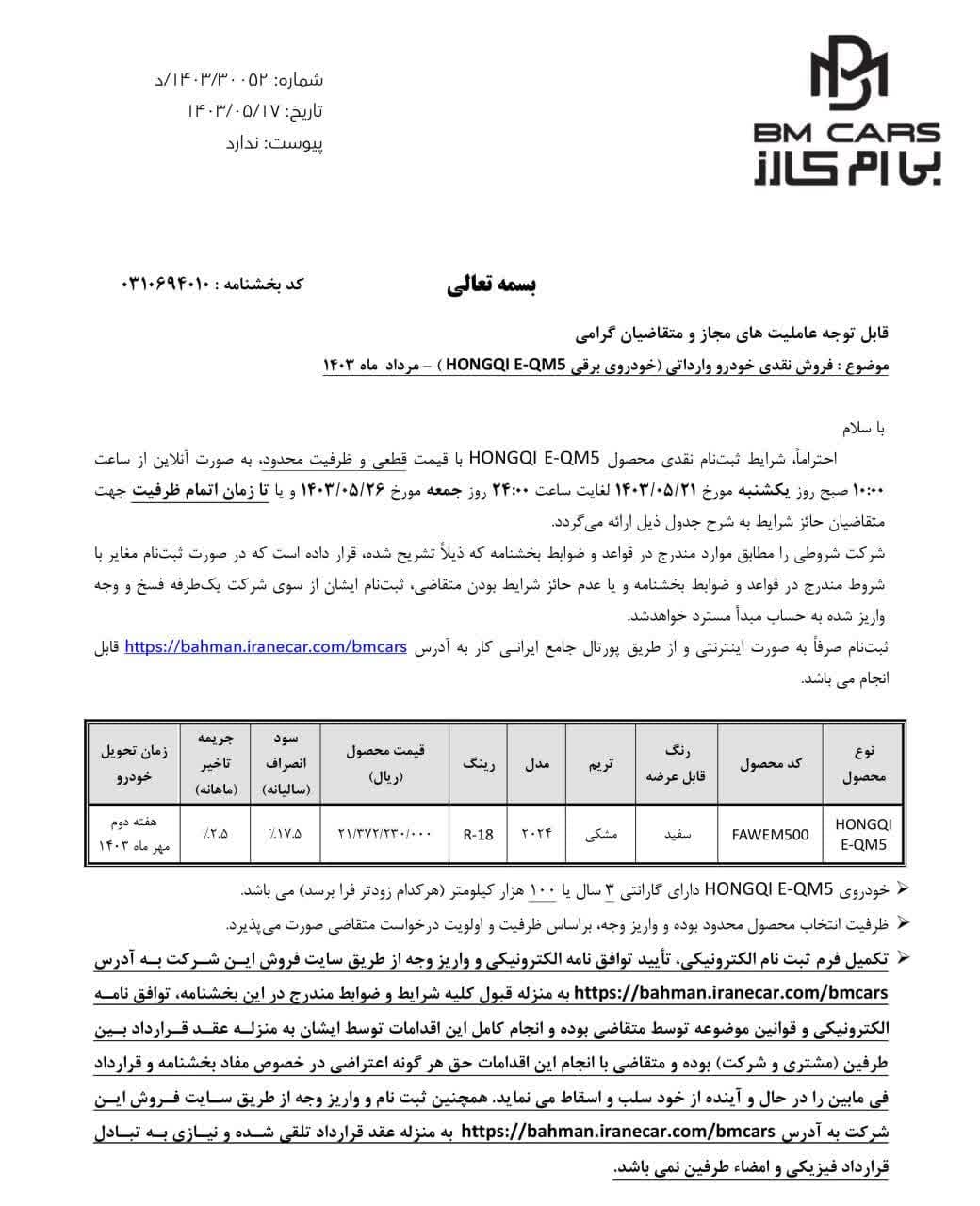 شرکت بی ام کارز که زیر مجموعه ای از گروه بهمن محسوب می شود و محصولات وارداتی گروه بهمن توسط این شرکت عرضه می شود، شرایط فروش هونگچی E-QM5 را اعلام کرده است.