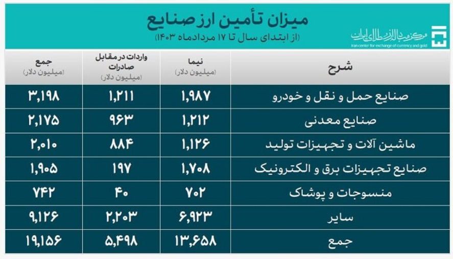 بررسی جزئیات تأمین ارز بخش صنایع نیز حاکی از آن است از ابتدای امسال تا ۱۷ مردادماه تأمین ارز نیمایی برای صنایع حمل و نقل و خودرو معادل یک میلیارد و ۹۸۷ میلیون دلار، صنایع معدنی معادل یک میلیارد و ۲۱۲ میلیون دلار، ماشین آلات و تجهیزات تولید معادل یک میلیارد و ۱۲۶ میلیون دلار، صنایع تجهیزات برق و الکترونیک معادل یک میلیارد و ۷۰۸ میلیون دلار و منسوجات و پوشاک معادل ۷۰۲ میلیون دلار بوده است.
