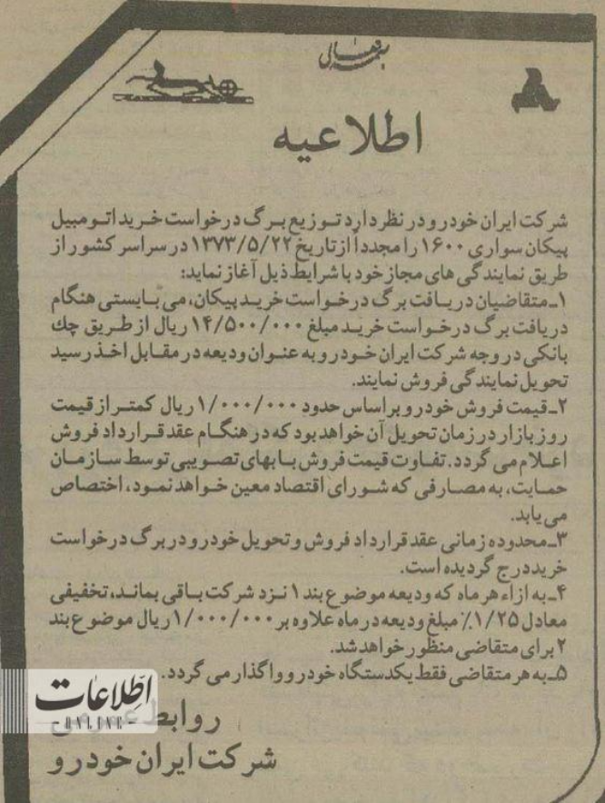 اطلاعیه ایران خودرو منتشر شده در روزنامه اطلاعات ۱۹ مرداد ۱۳۷۳ را بخوانید و عکسی از پیکان مدل ۱۶۰۰ تماشا کنید.