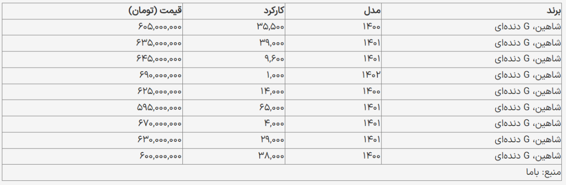 در آگهیهای بازار خودرو، شاهین اتومات مدل ۱۴۰۰ با کارکرد ۱۰ هزار کیلومتر امروز دوشنبه ۲۲ مرداد ماه ۶۰۰ میلیون تومان به فروش میرسد؛ همچنین در آگهی دیگری شاهین دندهای مدل ۱۴۰۱ با کارکرد ۶۵ هزار کیلومتر، ۵۹۵ میلیون تومان قیمت خورده است.