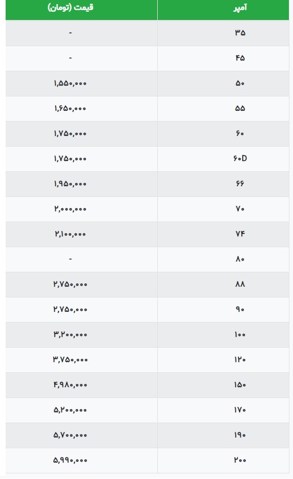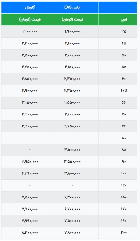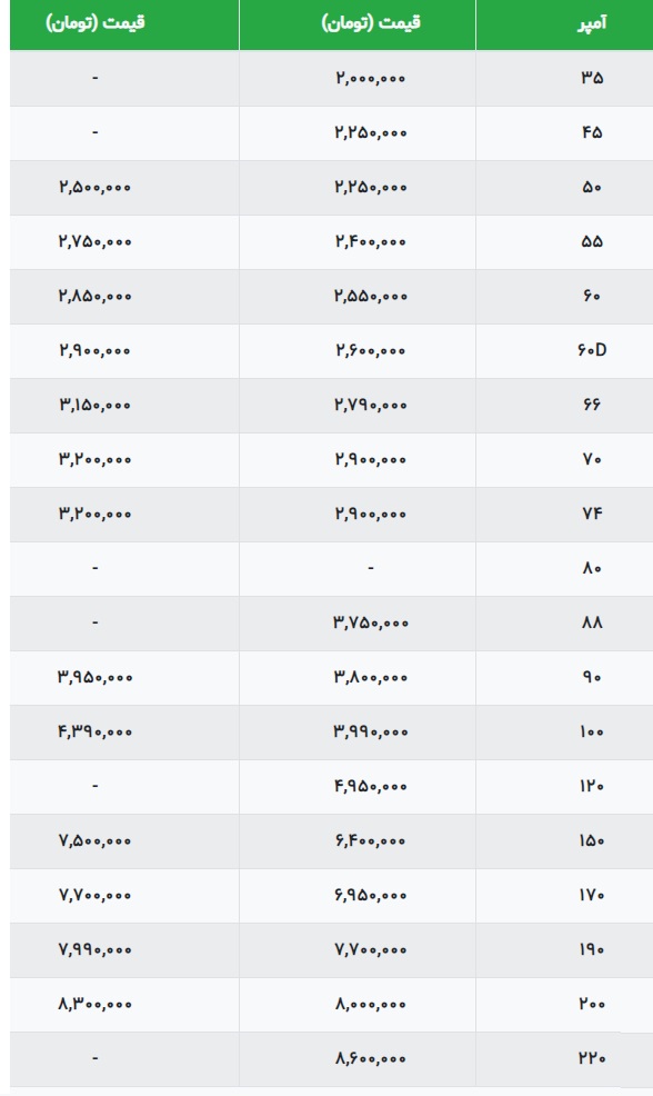 ایران جیب/ لیست قیمت جدید انواع باتری خودرو در بازار امروز دوشنبه 22 مرداد اطلاع رسانی شد.