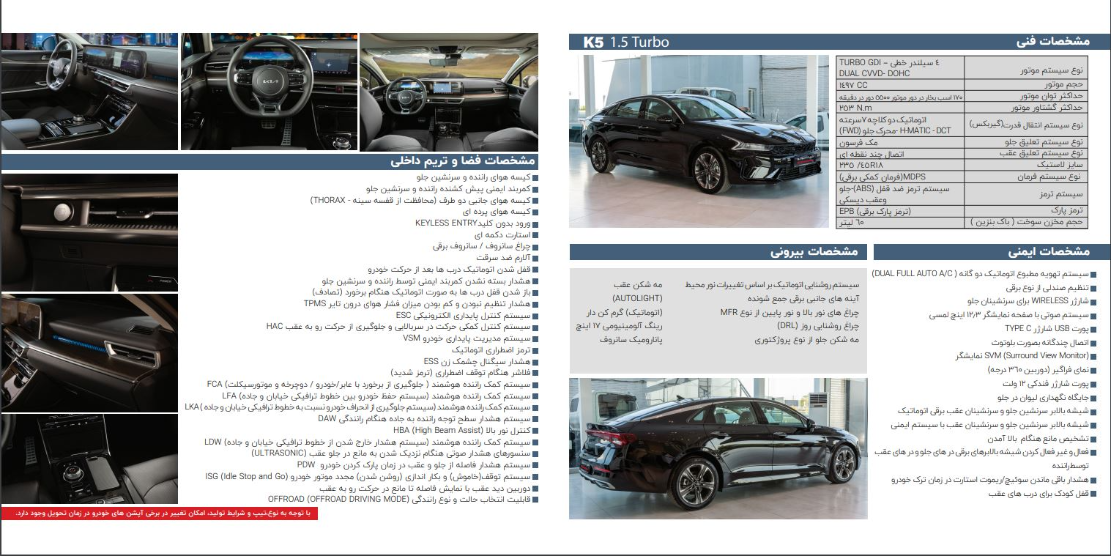 اکنون بعد از آن که شرکت کوشا خودرو از کیا K5 با پیشرانه توربوشارژ رونمایی کرد اقدام به انتشار کاتالوگ این محصول کرده که مشخصات فنی و امکانات این خودرو به صورت دقیق تری به مخاطب منتقل می شود.