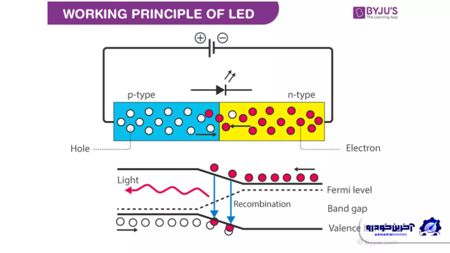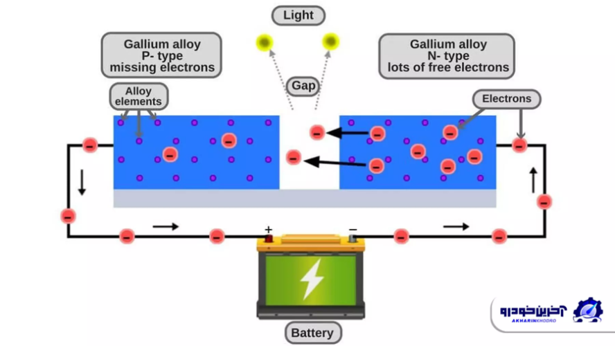 لایه n که دارای الکترونهای آزاد است و لایه p که دارای حفرههای آزاد است. وقتی که ولتاژ به دیود اعمال میشود، الکترونها از لایه n به لایه p حرکت میکنند و در این فرآیند انرژی آزاد میکنند که بهصورت نور ظاهر میشود. طول موج و رنگ نور تولید شده به نوع مواد نیمههادی و سطح انرژی الکترونهای آزاد بستگی دارد.