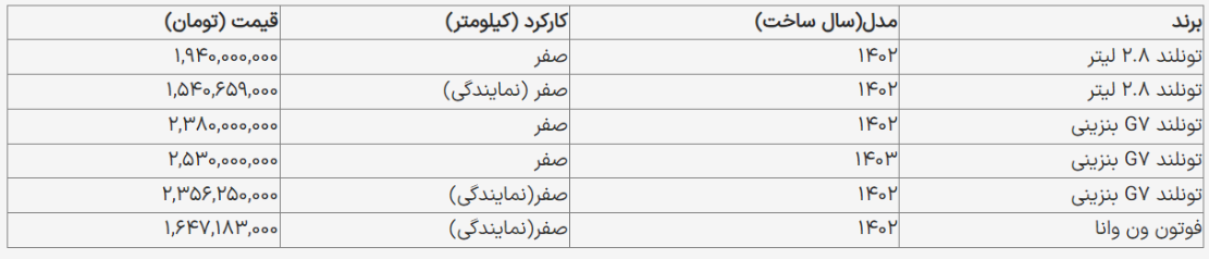 قیمت پیکاپ تونلند ۲.۸ لیتر مدل ۱۴۰۲ در بازار ۱ میلیارد و ۹۴۰ میلیون تومان شد که طی هفته اخیر ده میلیون تومان کاهش قیمت داشت.