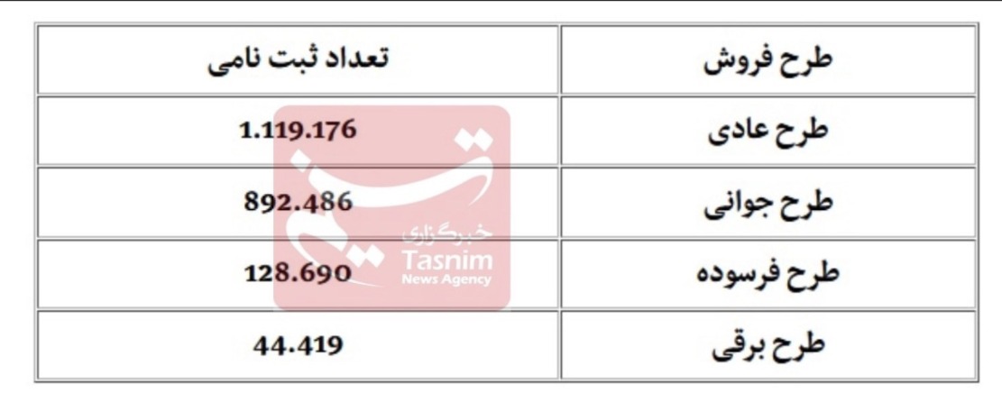 در حال حاضر آخرین آمار حکایت از آن دارد که تا ساعت 10 صبح امروز 2 میلیون و 184 هزار و 771 نفر به صورت کلی اقدام به ثبت نام کرده اند. از این آمار حدود 1 میلیون نفر با تشکیل حساب وکالتی در طرح عادی و مابقی در قالب طرح جوانی و خودروی فرسوده پیش ثبت نام را انجام داده اند.