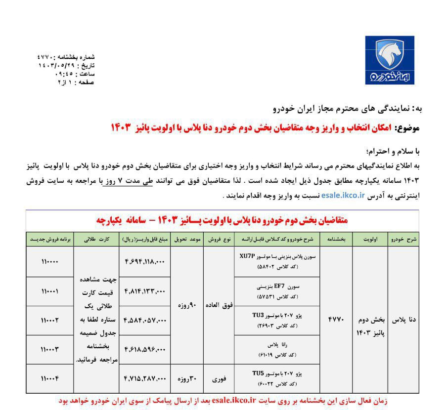 آخرین خبر/ فراخوان تبدیل اختیاری خودروی دنا پلاس ویژه متقاضیان بخش دوم اولویت پاییز 1403 منتشر شد.