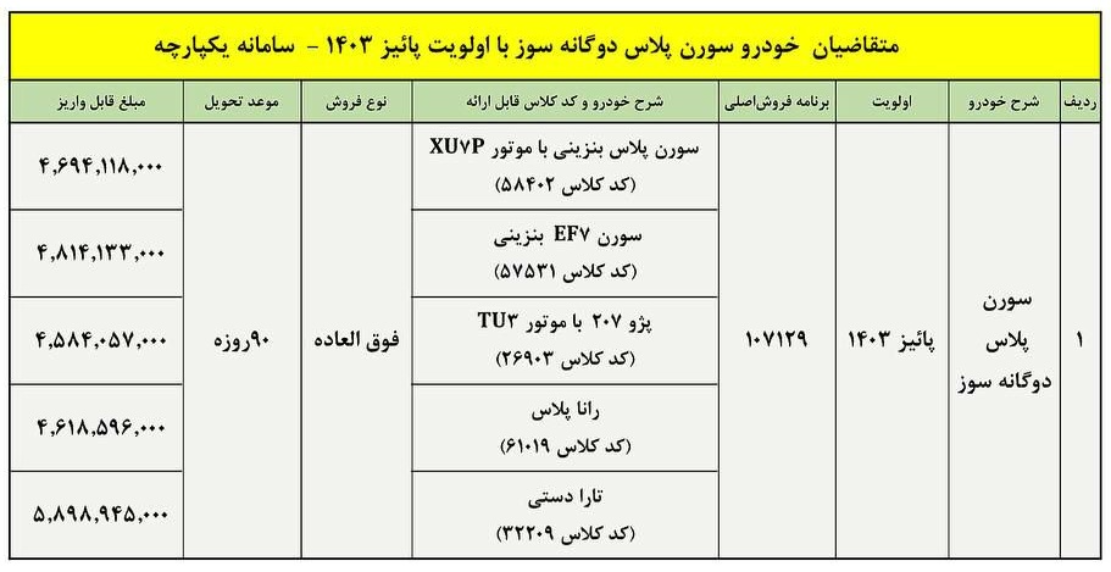 ایران جیب/ به اطلاع نمایندگی های محترم می رساند شرایط انتخاب و واریز وجه به تعداد محدود برای متقاضیان خودرو سورن پلاس دوگانه سوز با اولویت های پاییز 1403 سامانه یکپارچه، مطابق جدول ذیل ایجاد شده است.