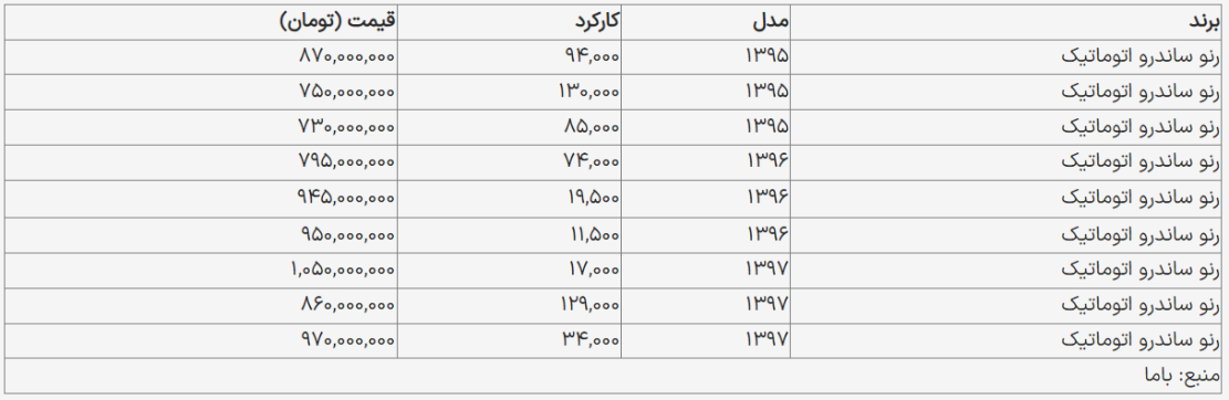 در آگهیهای بازار خودرو، رنو ساندرو اتوماتیک مدل ۱۳۹۷ با کارکرد ۳۴ هزار کیلومتر امروز سوم شهریور ماه ۹۷۰ میلیون تومان به فروش میرسد؛ همچنین در آگهی دیگری ساندرو اتوماتیک مدل ۱۳۹۶ با کارکرد ۷۴ هزار کیلومتر، ۷۹۵ میلیون تومان قیمت خورده است.