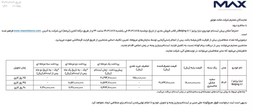 / به تازگی شرکت مکث موتور شرایط فروش تیارا پرایم (بیجینگ X7) را اعلام کرده است و مشتریان می توانند جهت ثبت نام اقدام نمایند.