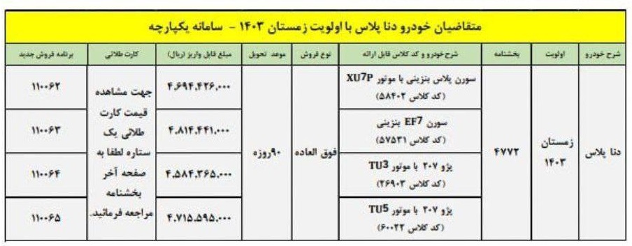 ایران جیب/ به اطلاع نمایندگی ها و متقاضیان محترم می رساند، شرایط انتخاب و واریز وجه اختیاری برای متقاضیان خودروی دنا پلاس با اولویت زمستان 1403 سامانه یکپارچه مطابق جدول ذیل ایجاد شده است. لذا متقاضیان فوق می توانند طی مدت 7 روز با مراجعه به سایت فروش اینترنتی به آدرس esale.ikco.ir نسبت به واریز وجه اقدام نمایند.
