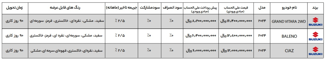 ایران جیب/ نماینده فروش خودروهای سوزوکی در ایران، به منظور پاسخگویی به تقاضای روزافزون مشتریان و تکمیل سبد محصولات خود، اقدام به عرضه محدودی از خودروهای وارداتی SUZUKI و GAC در شهریور ماه 1403 نموده است.