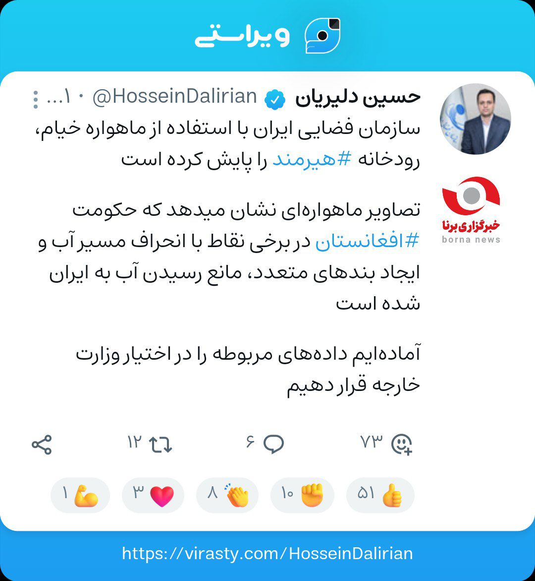 حالا حسین دلیریان سخنگوی سازمان فضایی کشورمان با انتشار یک وبرایست در صفحه شخصی خود ضمن اشاره به شیطنتهای حکومت افغانستان برای عدم تخصیص حق آبه ایران از آمادگی سازمان فضایی برای اشتراک گذاری این دادهها با وزارت امور خارجه سخن گفت، وی در ویراست خود نوشت؛