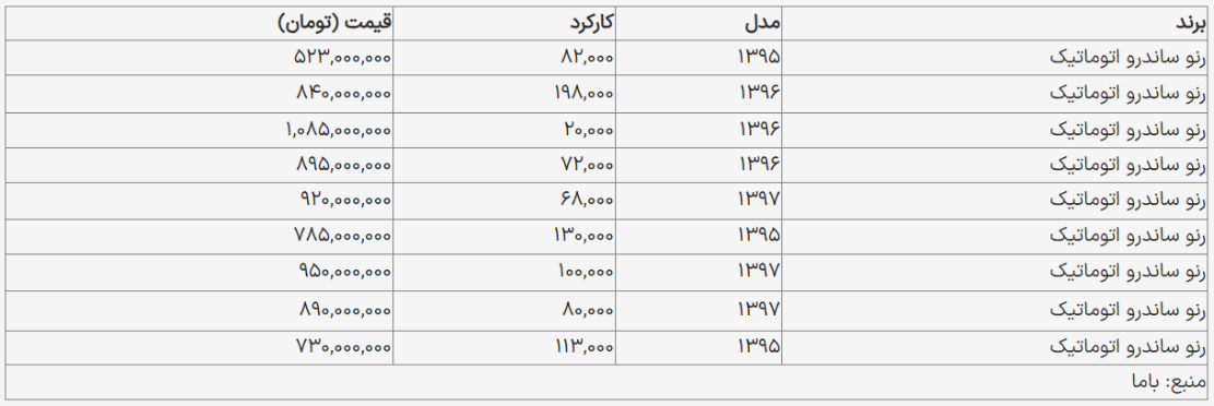 در آگهیهای بازار خودرو، رنو ساندرو اتوماتیک مدل ۱۳۹۵ با کارکرد ۸۲ هزار کیلومتر امروز دهم شهریور ماه ۵۲۳ میلیون تومان به فروش میرسد؛ همچنین در آگهی دیگری ساندرو اتوماتیک مدل ۱۳۹۶ با کارکرد ۱۹۸ هزار کیلومتر، ۸۴۰ میلیون تومان قیمت خورده است.