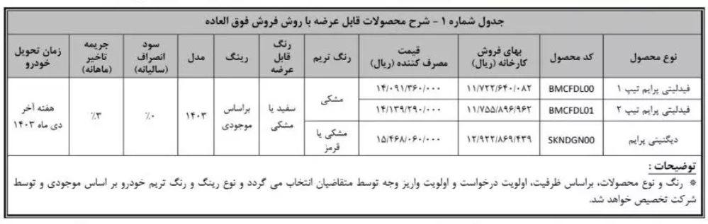 این طرح ویژه منتخبین سامانه یکپارچه می باشد و از ساعت ۱۰ صبح روز شنبه مورخ ۱۴۰۳/۰۶/۱۷ بر روی سایت فروش اینترنتی بهمن موتور فعال خواهد شد.
