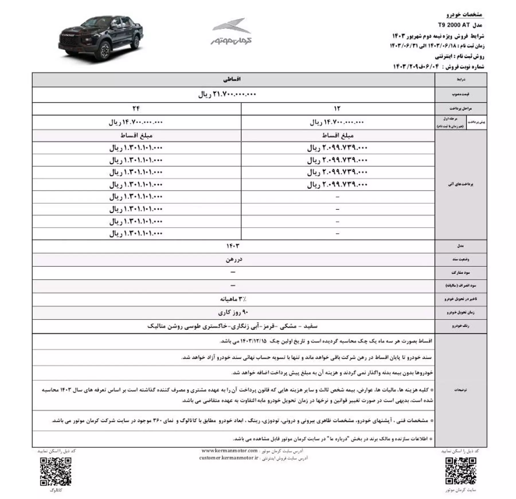 به گزارش پایگاه خبری ، شرکت کرمان موتور شرایط فروشی را برای KMC T8 ویژه شهریور ۱۴۰۳ اعلام کرده و قرار است این محصول را تنها به صورت اقساطی و با اقساط ۱۲ و ۲۴ ماهه عرضه کند. قیمت پیش پرداخت KMC T9 در این طرح در هر دو شرایط ۱۲ و ۲۴ ماهه، ۱،۴۷۰،۰۰۰،۰۰۰ تومان عنوان شده است.