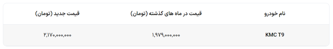 نکته مهم در مورد این شرایط فروش این است که قیمت درب کارخانه KMC T9 با افزایش قیمت همراه بوده و قیمت آن به ۲,۱۷۰,۰۰۰,۰۰۰ تومان رسیده است.