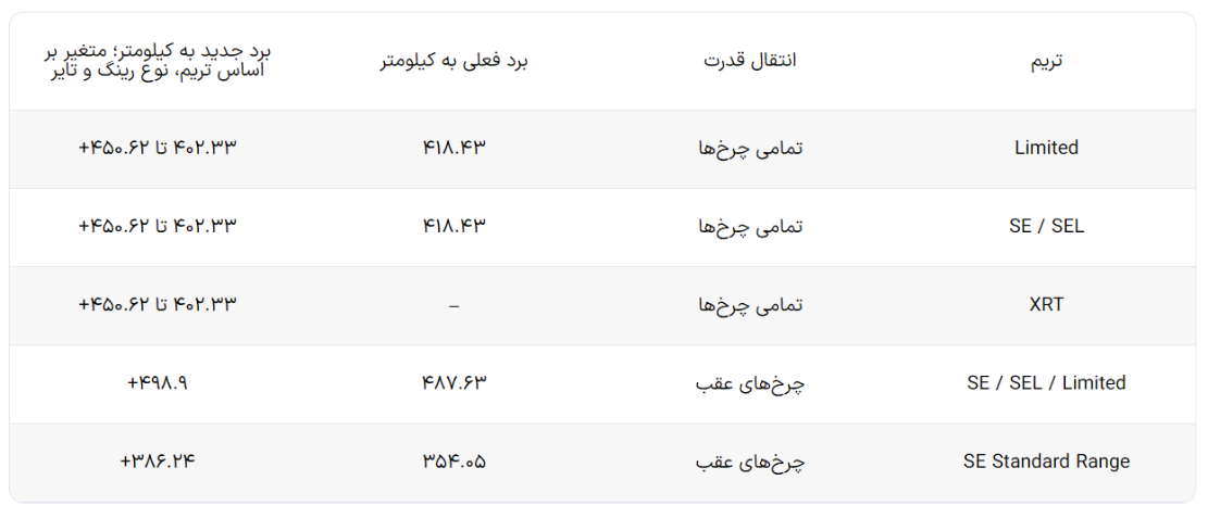 علاوه بر معرفی تریم جدید XRT، هیوندای تغییرات بزرگی در باتریهای آیونیک ۵ برای مدل ۲۰۲۵ انجام داده است. در مدل استاندارد، ظرفیت باتری از ۵۸ به ۶۳ کیلووات ساعت ظرفیت افزایش یافته؛ در نسخه برد طولانی هم باتری ۷۷.۴ کیلووات ساعتی جای خود را به باتری ۸۴ کیلووات ساعتی داده است. میتوانید در جدول زیر برد حرکتی همه نسخهها را به تفکیک مشاهده نمایید.