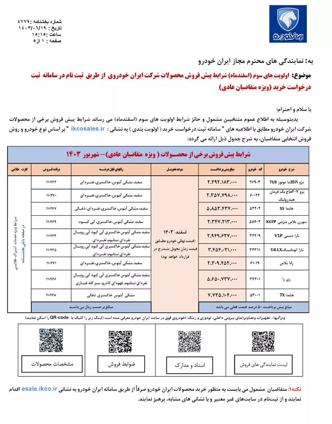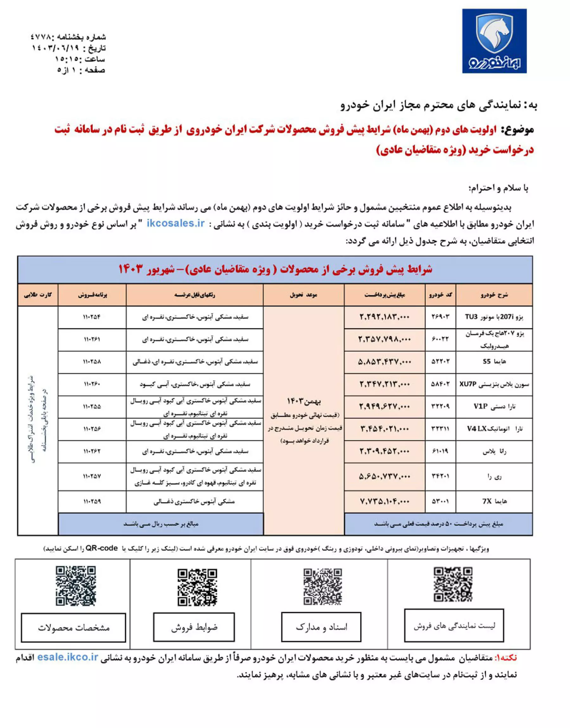 جداول پیش فروش (طرح عادی) ایران خودرو