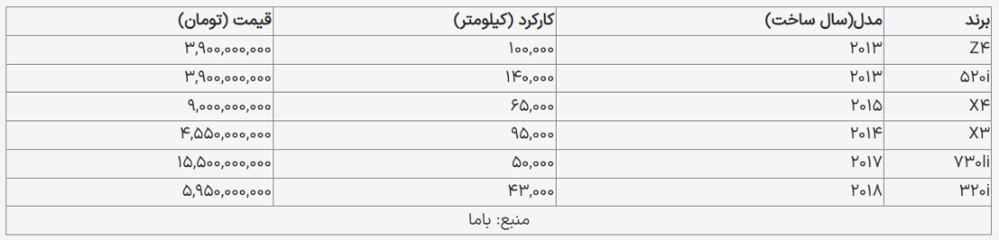 با مطالعه جدول زیر اطلاعات کاملی درباره قیمت روز خودروهای BMW به دست خواهید آورد: