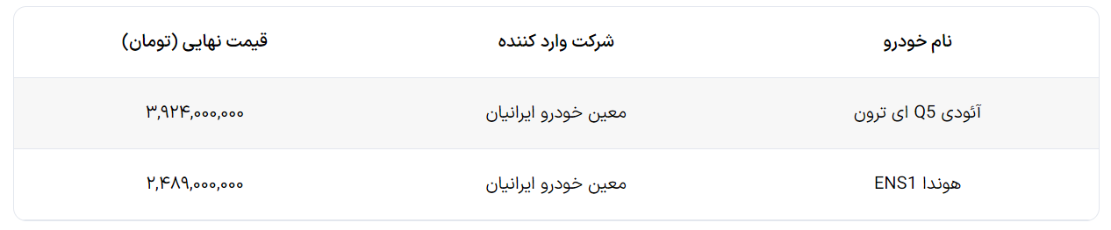 جدول قیمت نهایی دو محصول برقی معین خودرو