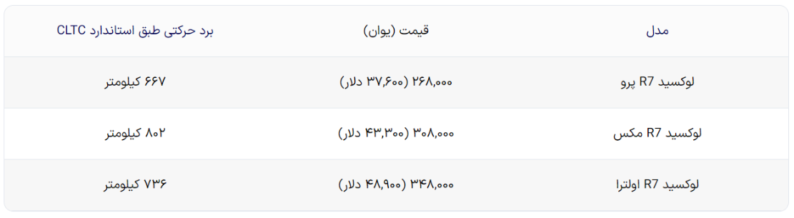 در جدول زیر میتوانید لیست قیمت و برد حرکتی تیپهای مختلف لوسید R7 را به تفکیک مشاهده نمایید: