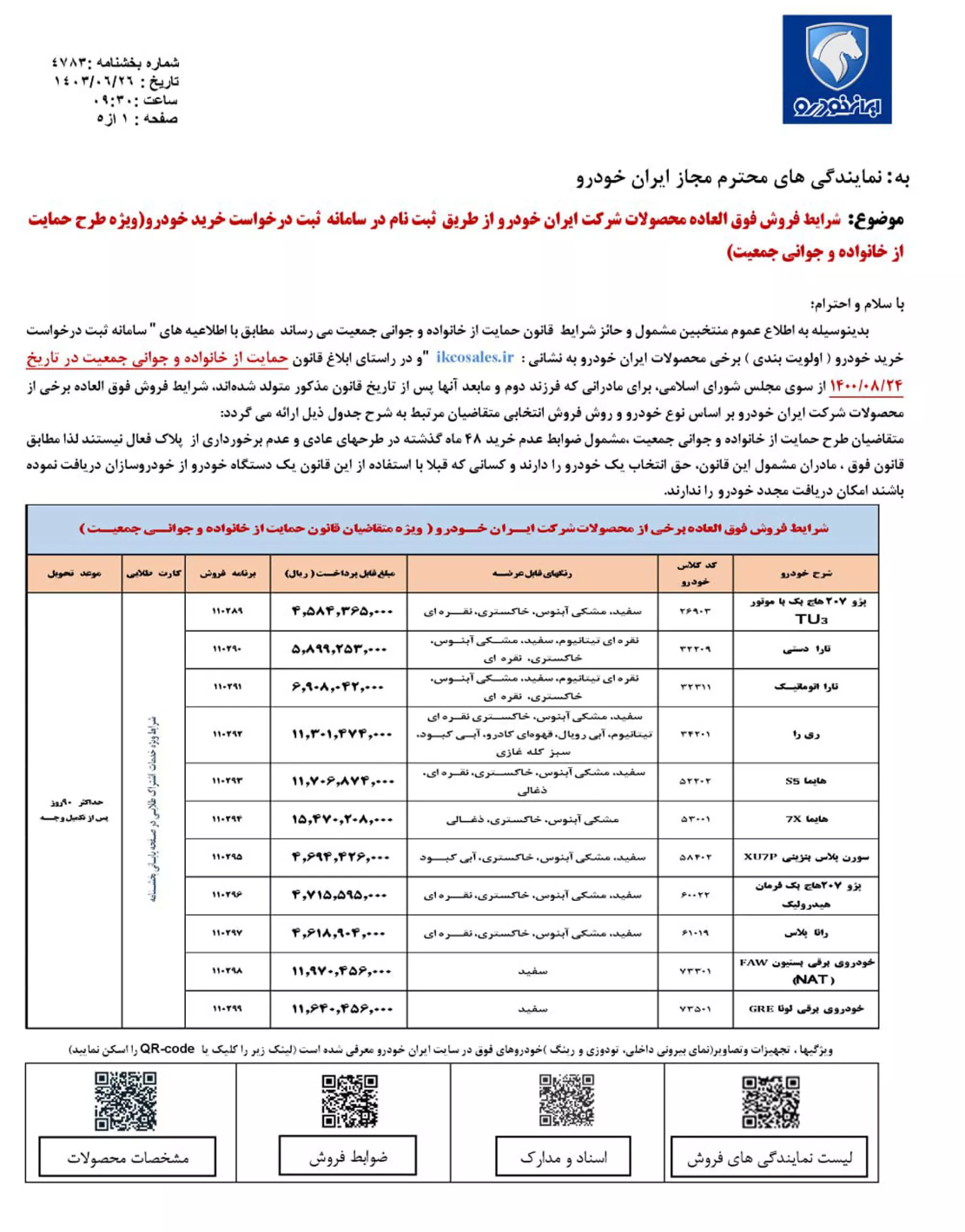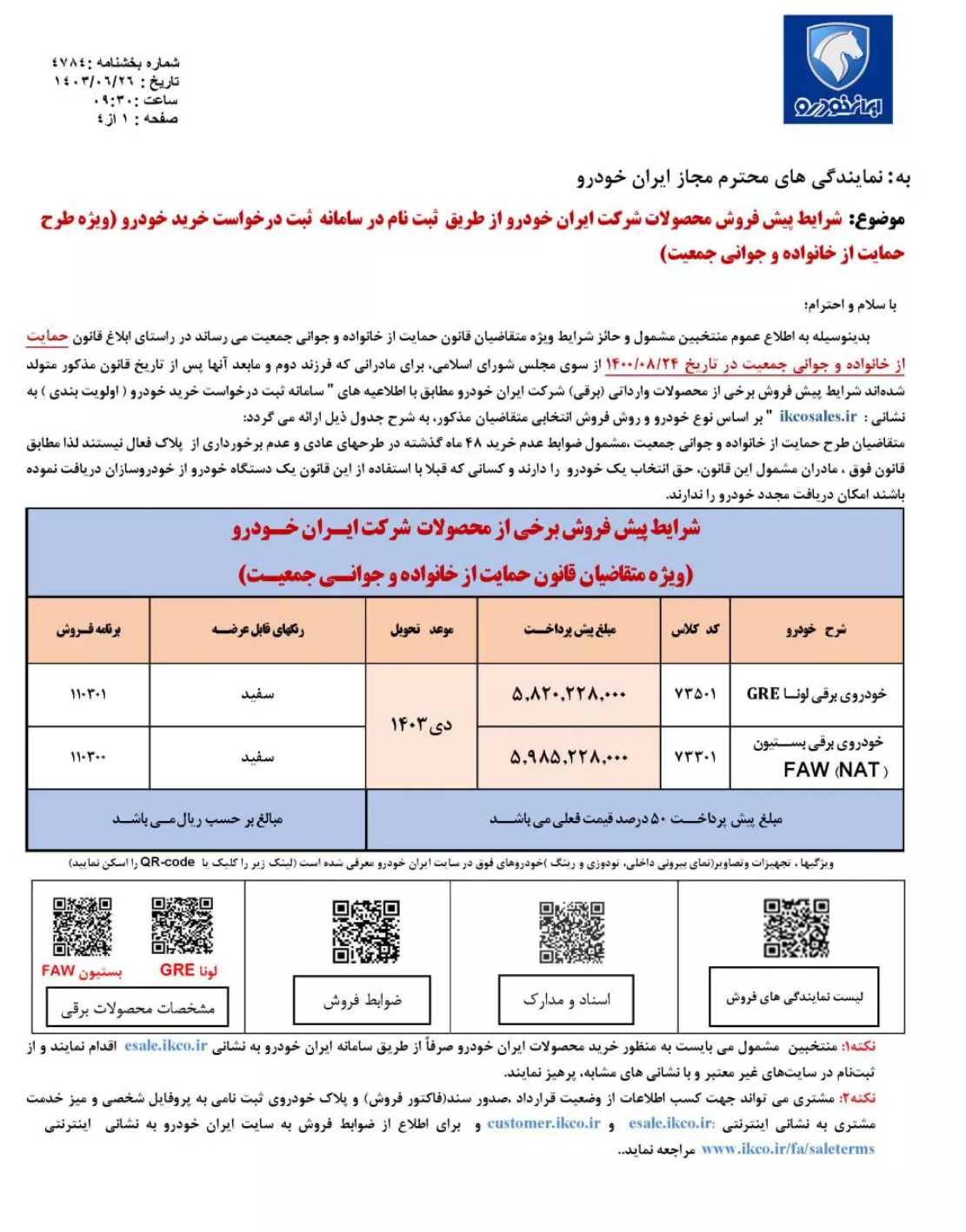 دیروز عصر بود که نتایج قرعه کشی ایران خودرو برای طرح مادران اعلام شد و امروز شرایط فروش فوق العاده و پیش فروش خودروهای طرح جوانی جمعیت منتشر شده است. بر این اساس مشتریان می توانند بسته به نوع خرید خود نسبت به پرداخت مبالغ و انجام ثبت نام اقدام نمایند. در اطلاعیه منتشر شده فعلا شرایط پیش فروش محصولات برقی و فوق العاده محصولات بنزینی اعلام شده است و به نظر می رسد به زودی جزئیات دیگر شرایط فروش ها هم مشخص خواهد شد.
