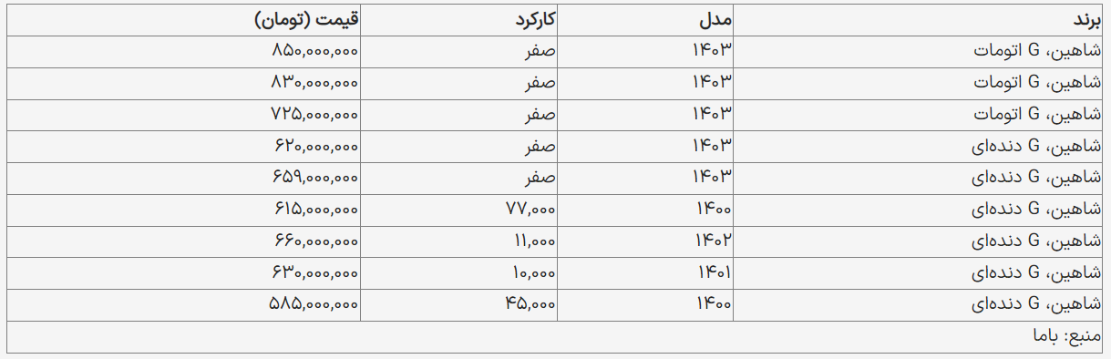 در آگهیهای بازار خودرو، شاهین دندهای مدل ۱۴۰۰ با کارکرد ۴۵ هزار کیلومتر امروز پنجشنبه ۲۹ شهریور ماه ۵۸۵ میلیون تومان به فروش میرسد؛ همچنین در آگهی دیگری شاهین اتومات مدل ۱۴۰۳ صفر، ۸۵۰ میلیون تومان قیمت خورده است.
