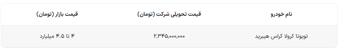 / با آغاز شماره گذاری و تحویل نمونه های اول از خودروهای کرولا کراس هیبرید، قیمت این محصول واردات در بازار آزاد مشخص شده است.