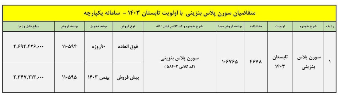 ایران جیب/ شرایط انتخاب و واریز وجه برای متقاضیان خودروی سورن پلاس بنزینی ایران خودرو با اولویت تابستان 1403 سامانه یکپارچه، مطابق جدول پیوست ایجاد شده است. متقاضیان فوق میتوانند طی مدت 10 روز با مراجعه به سایت فروش اینترنتی به آدرس esale.ikco.ir نسبت به واریز وجه اقدام نمایند.